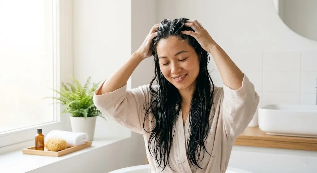 3. Massage nhẹ nhàng lên da đầu theo chuyển động tròn trong 2–3 phút để kích thích tuần hoàn máu.